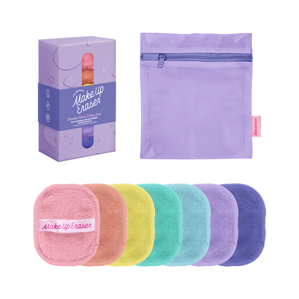 Includes: (7) daily cloths 5" x 4" & laundry bag Erase all makeup with JUST WATER™ including waterproof. Our patented, water-activated, cloud-soft fibers gently & easily remove all makeup & sunscreen from pores. 2 in 1 benefit: one side erases makeup & one side exfoliates skin. The Original MakeUp Eraser® is non-irritating and non-drying. It's non-comedogenic, safe for lash extensions, & entirely oil-free for a comfortable experience. ✓ Dermatologist Recommended ✓ Reusable & machine washable (1000+) ✓ Clinically proven to remove makeup & sunscreen 2.5x better than the leading brand of makeup wipes MakeUp Eraser is powered by SmartErase™ Technology, featuring unique cross-section microfibers engineered for efficient makeup removal using electrostatic forces, & enhanced when wet. This innovation also allows for easy stain removal with machine washing.