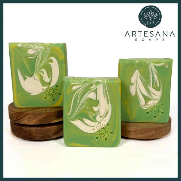 Bright, bubbly, and totally fun—this soap smells like grape candy and peppermint had a giggle fit. It’s swirled in cheerful green, yellow, and white, and finished with a snowflake.